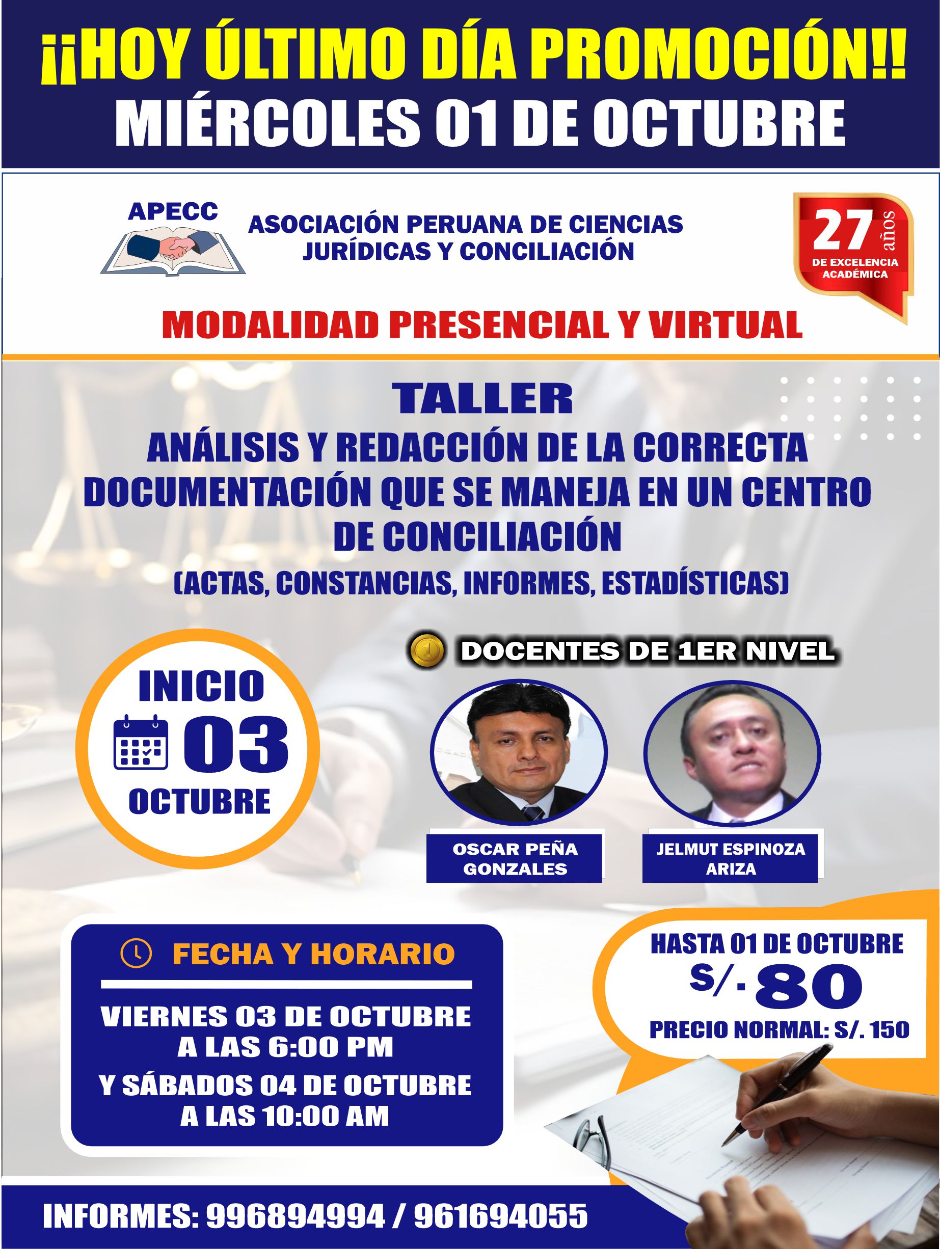 La Asociación Peruana de Ciencias Jurídicas y Conciliación (APECC), por iniciativa del Joven Abogado Oscar Peña Gonzales, es constituida a finales del año 1990, en el Distrito de Lince, Pronvincia y Departamento de Lima. Desde su inicio, esta Institución se ha caracterizado por ser formadora de hombres con una visión clara de la vida y una misión de servicio continuo a sus semejantes.
